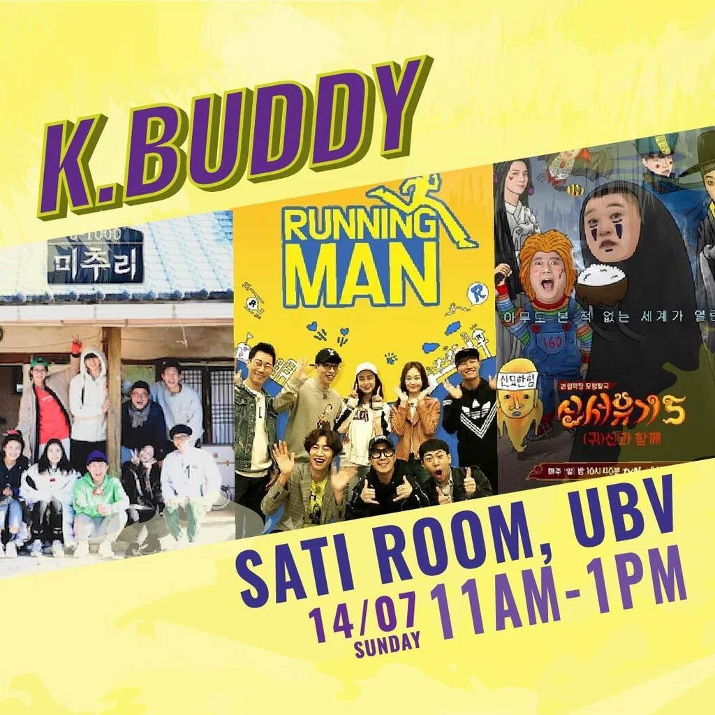 “Hi everyone #BUDDYIndoorSession is back! This time around, we will be playing Indoor Games based on Korean Variety Shows If you’re interested, do come and join us this Sunday (14/7), from 11.00 am to 1.00 pm at Sati Room, UBV!