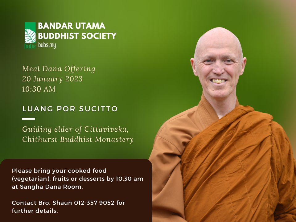 We are delighted that Luang Por Sucitto has kindly accepted our invitation for meal dana on Friday, 20 January 2023. Do not miss this opportunity to welcome the new lunar year with the act of sharing and giving. Bring your family and friends along.